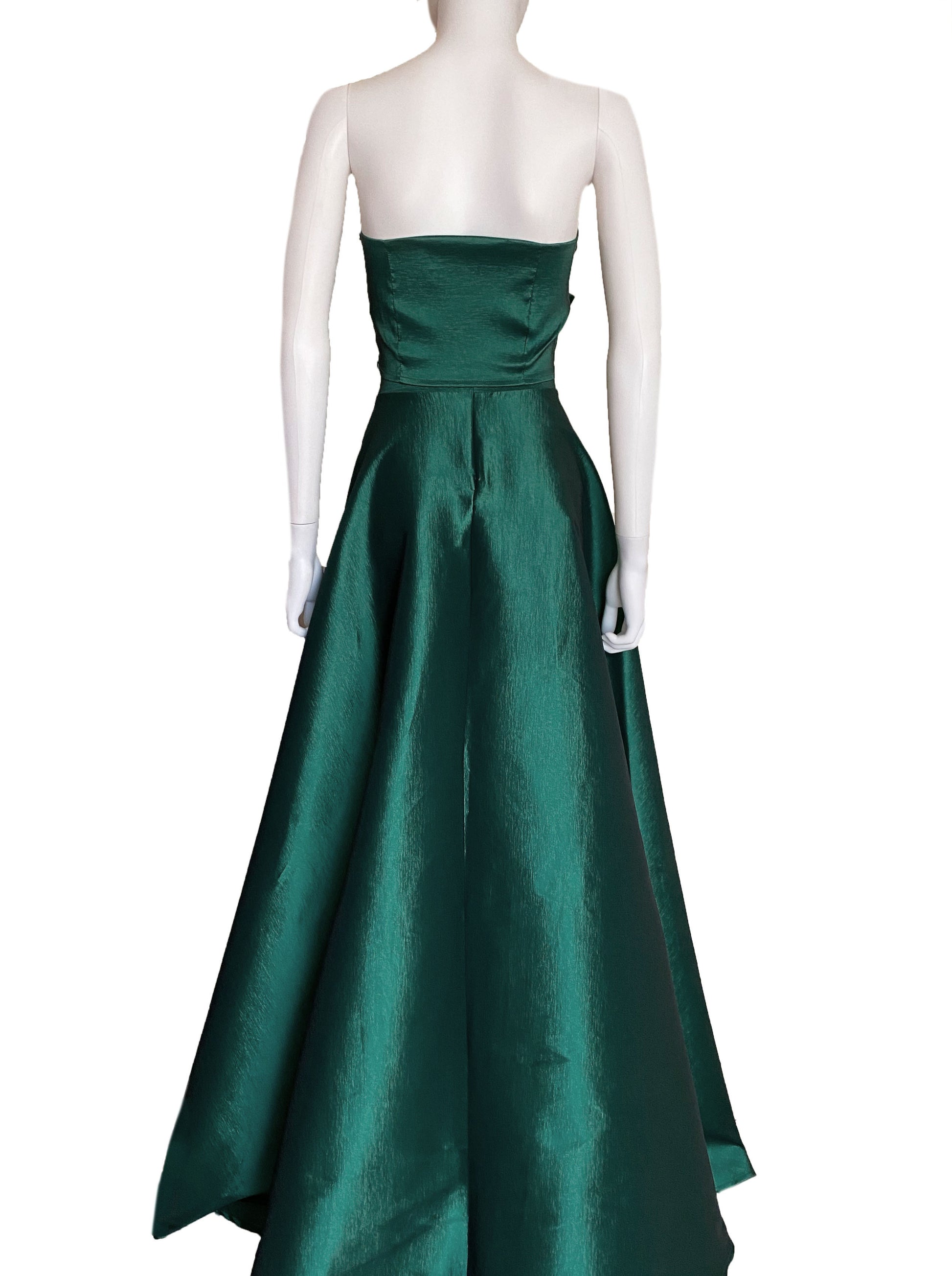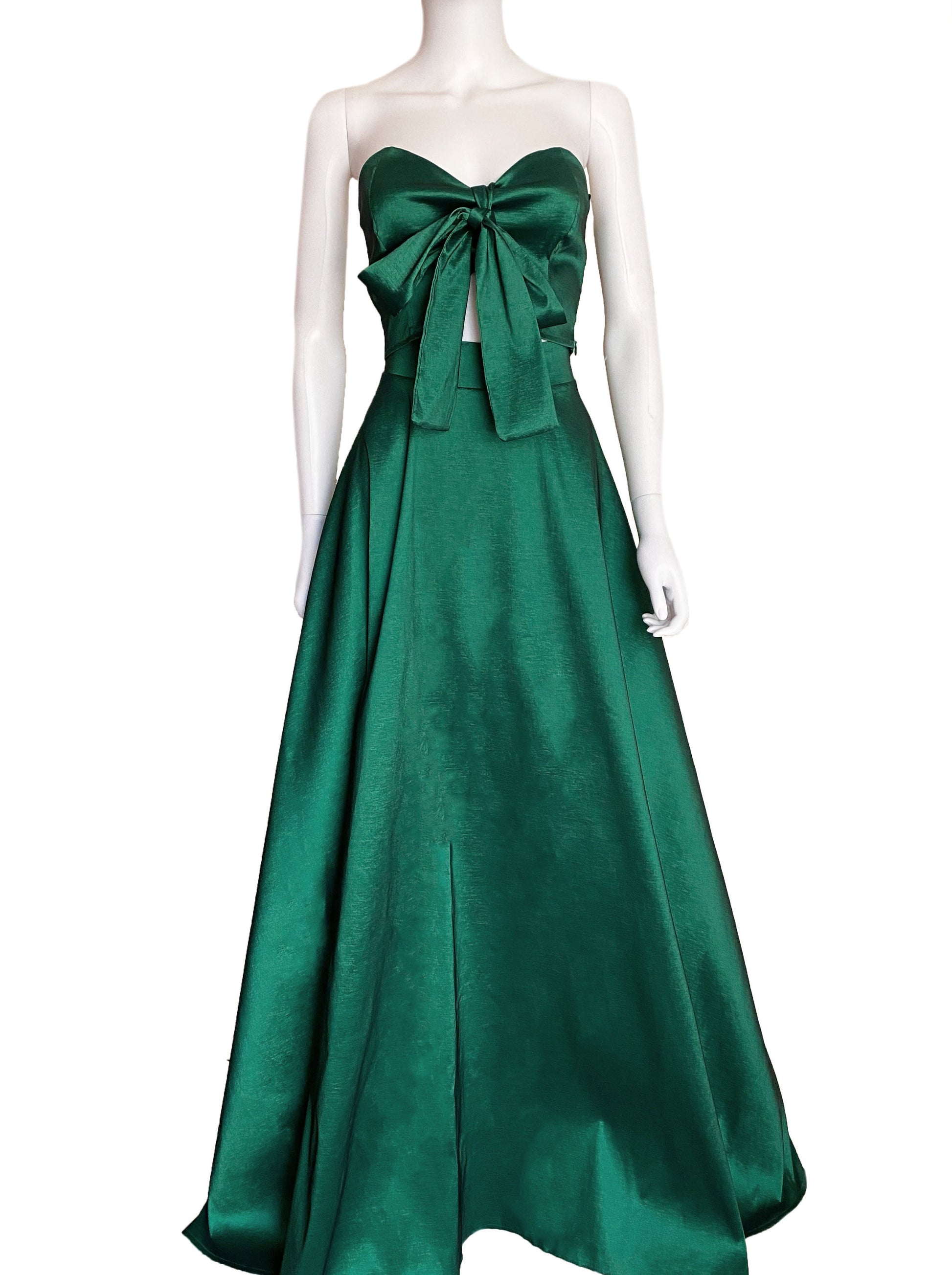 Vestido color verde verde esmeralda, con detalle de moño en el pecho , el moño se hace por separado trae un cintillo y este se amarra y da el efecto del moño , el vestido viene en dos piezas pero da efecto de solamente una pieza.