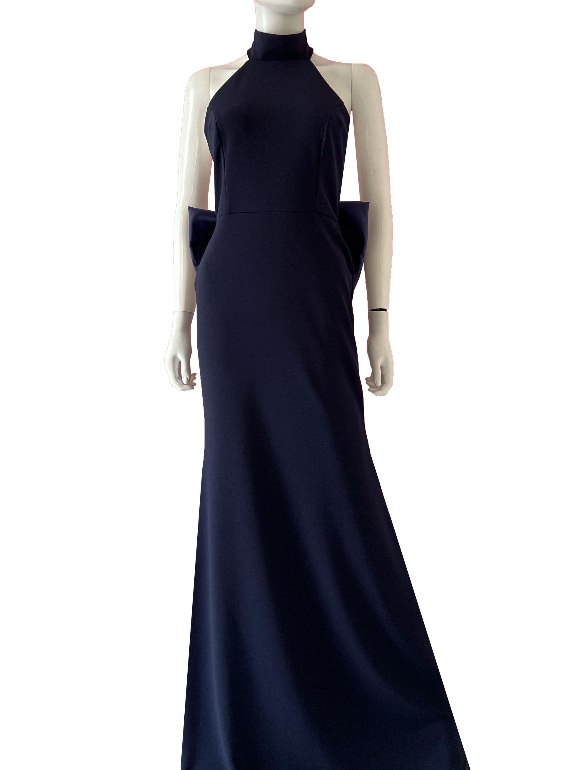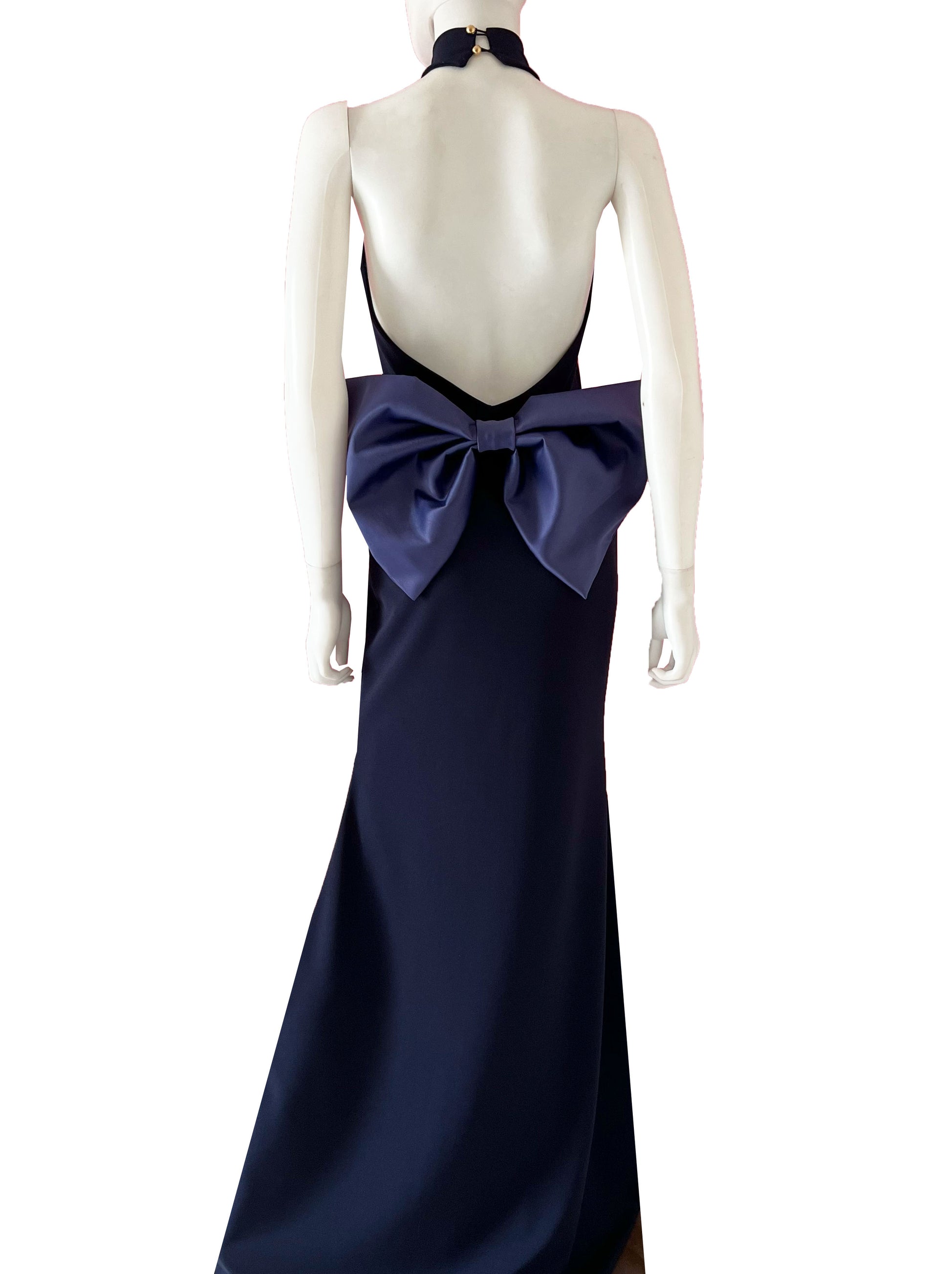 Vestido con detalle de moño en satín y espalda descubiertan.