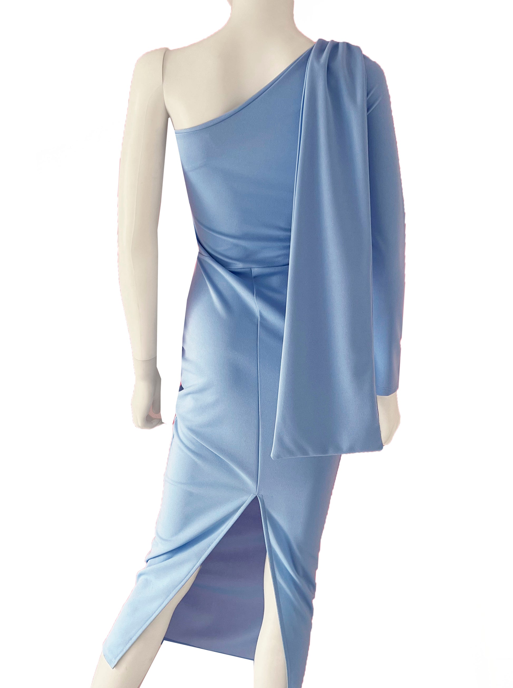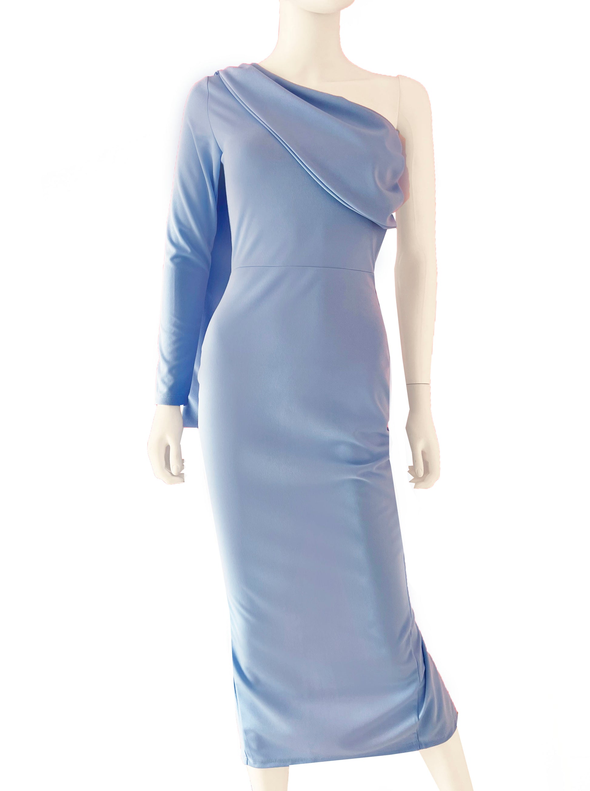 Vestido con detalle de una manga y colgante en un hombro , largo a la pantorrilla