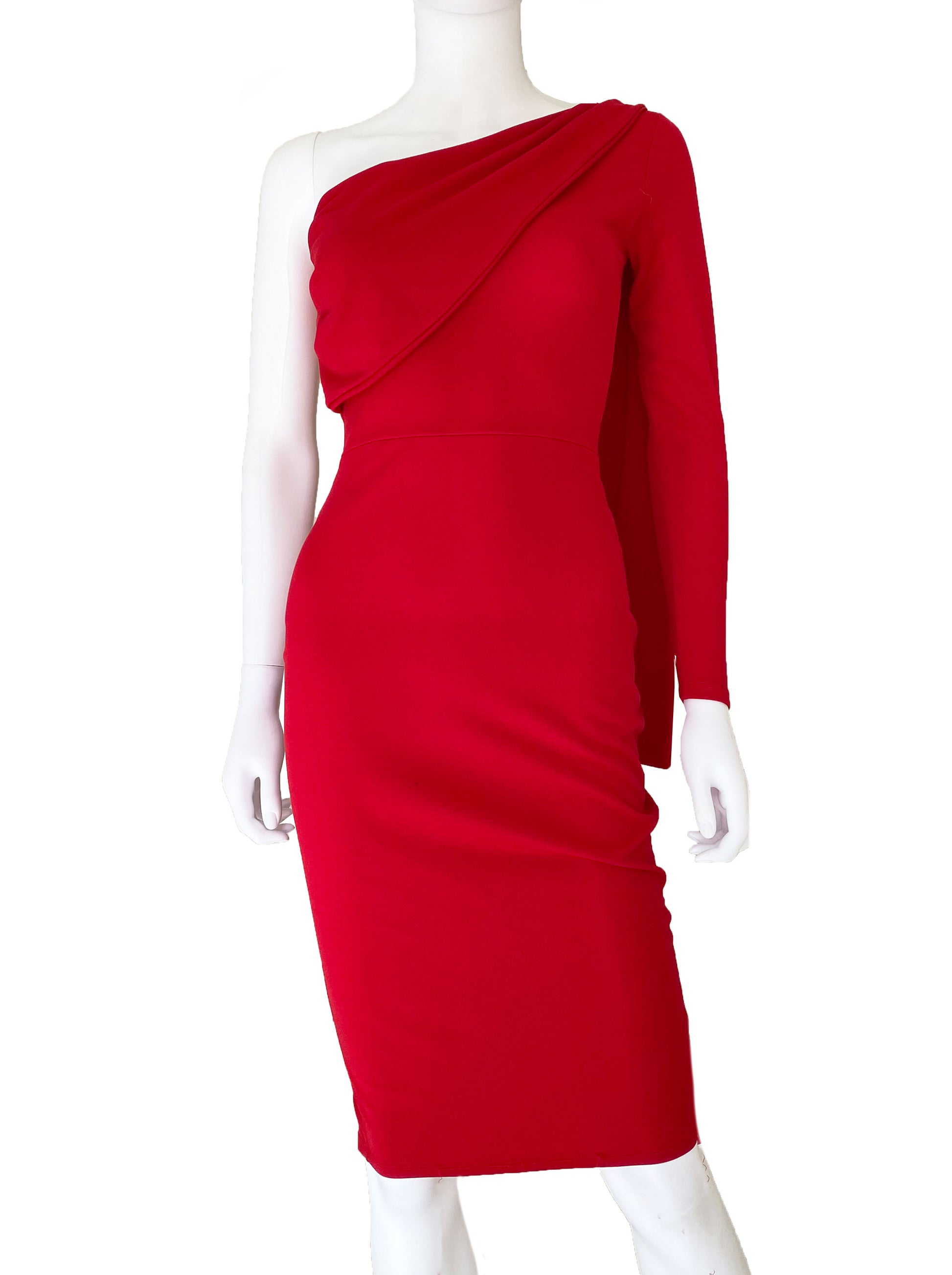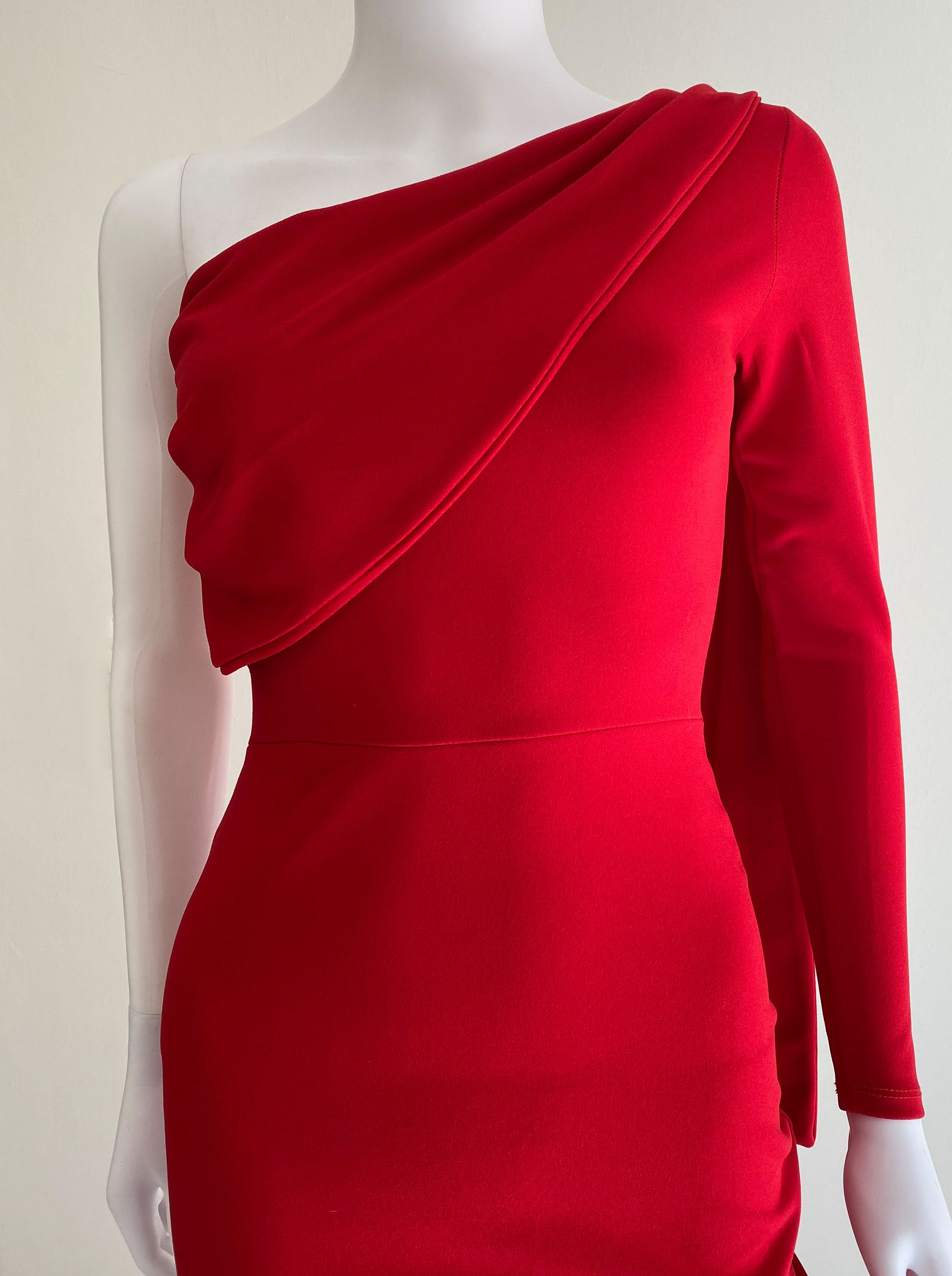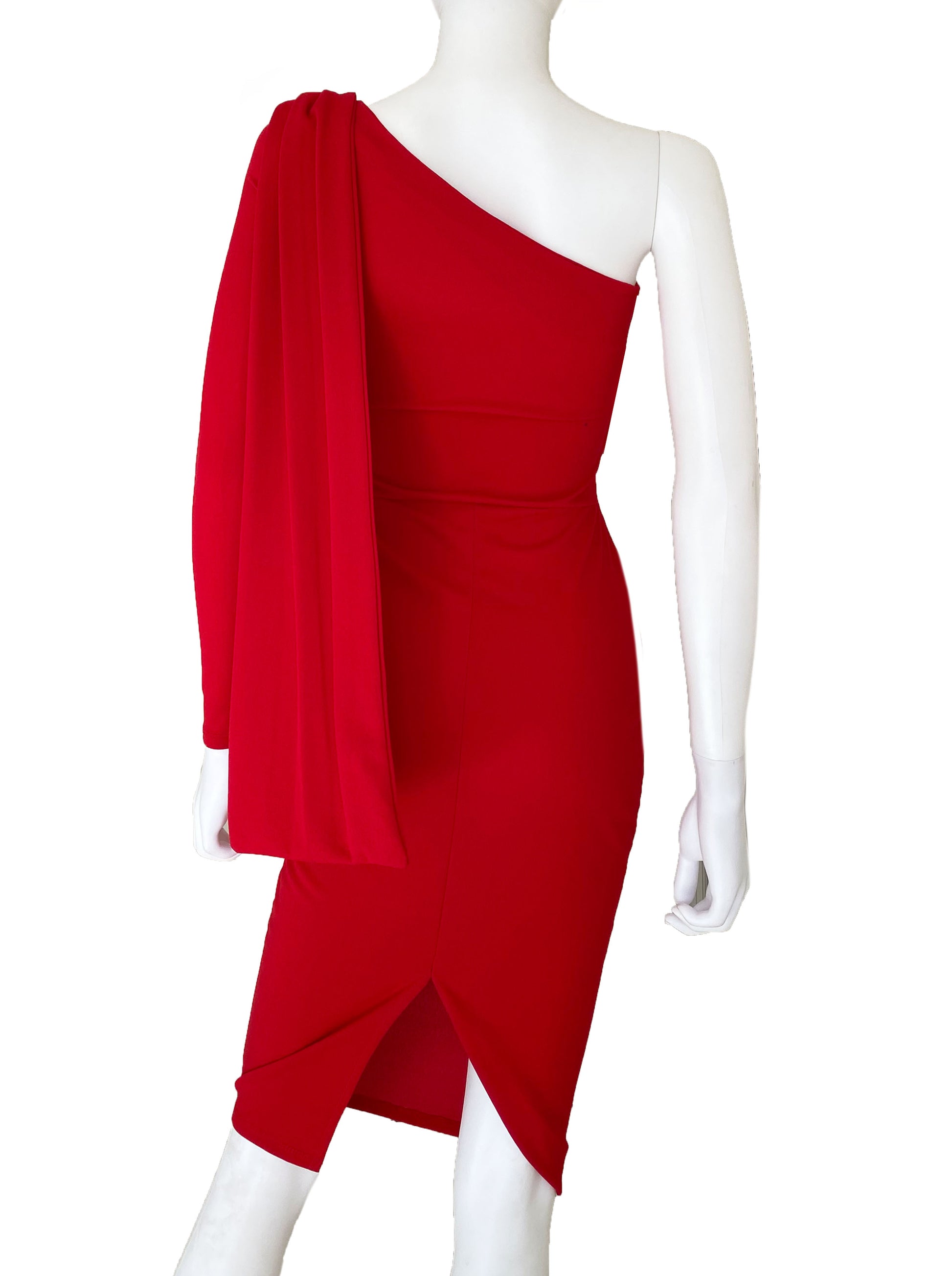 Vestido con detalle de una manga y colgante en un hombro , corte midi.