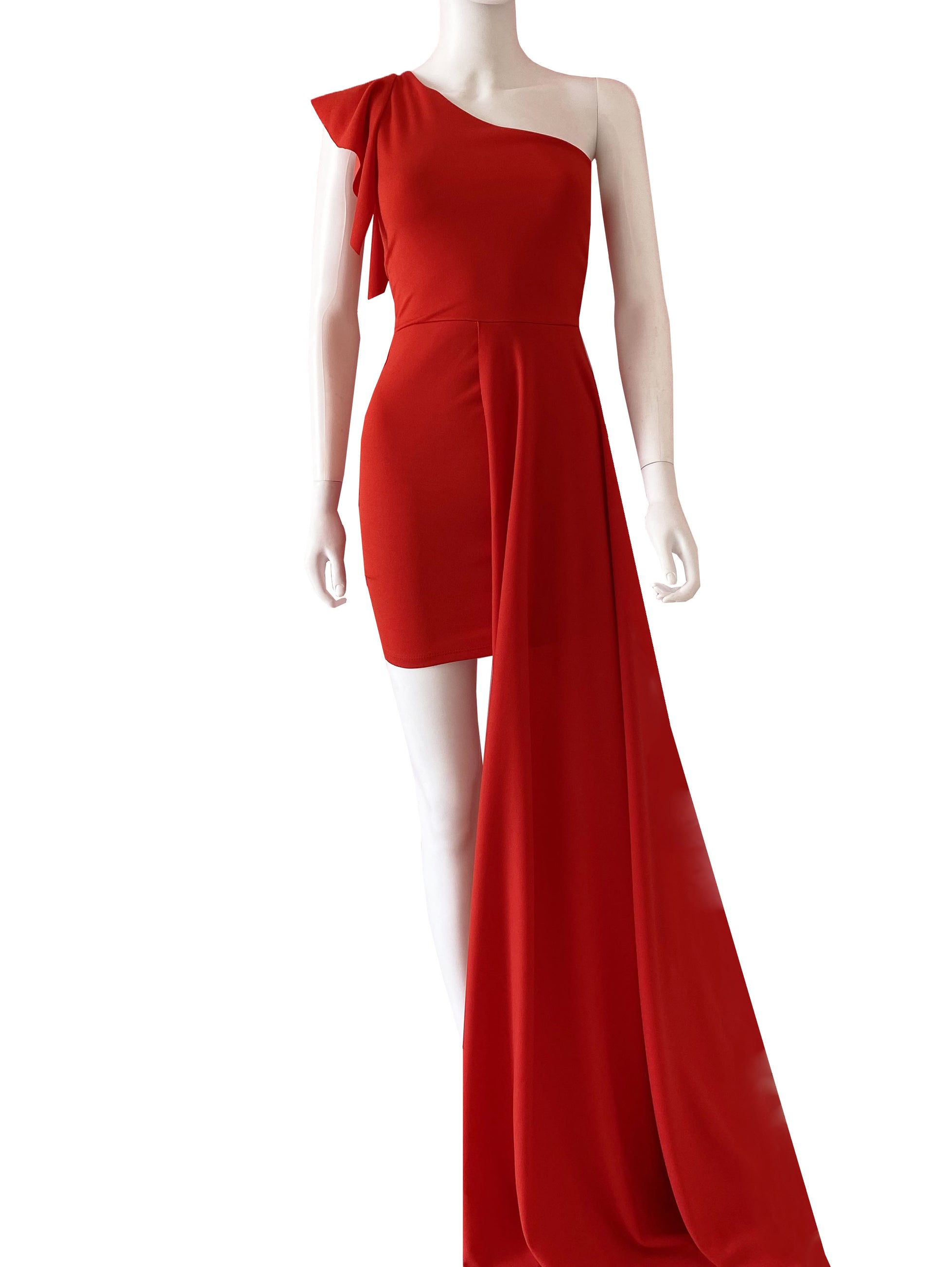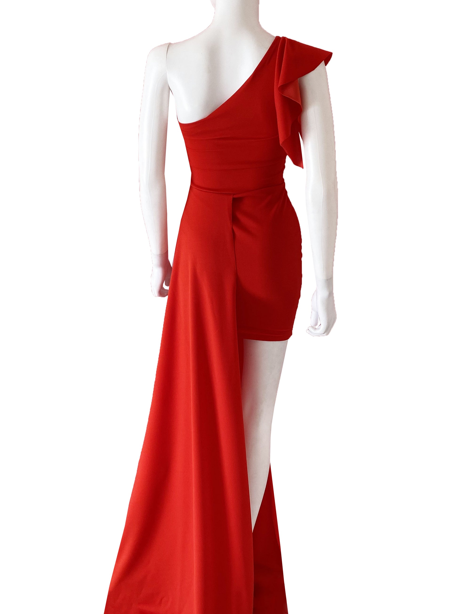 Vestido con detalle de holán en hombro ,falda corta y una falda al costado para dar efecto asimétrico,