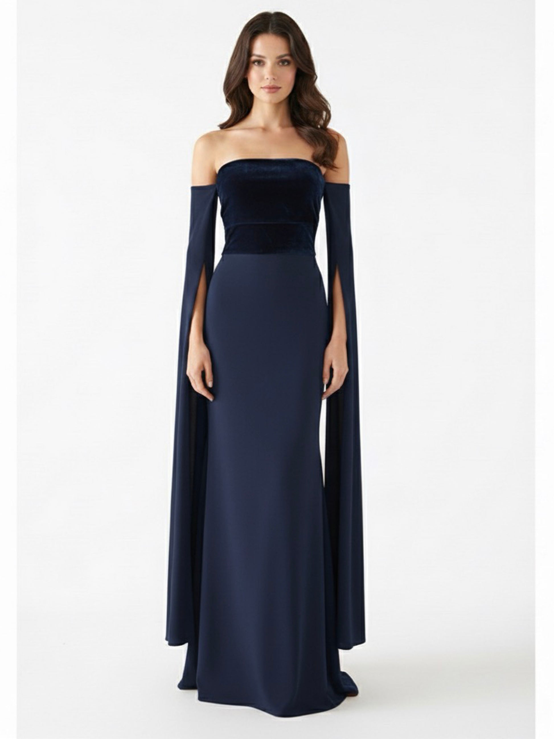 Vestido azul marino con mangas colgantes strapless con detalle de velvet.