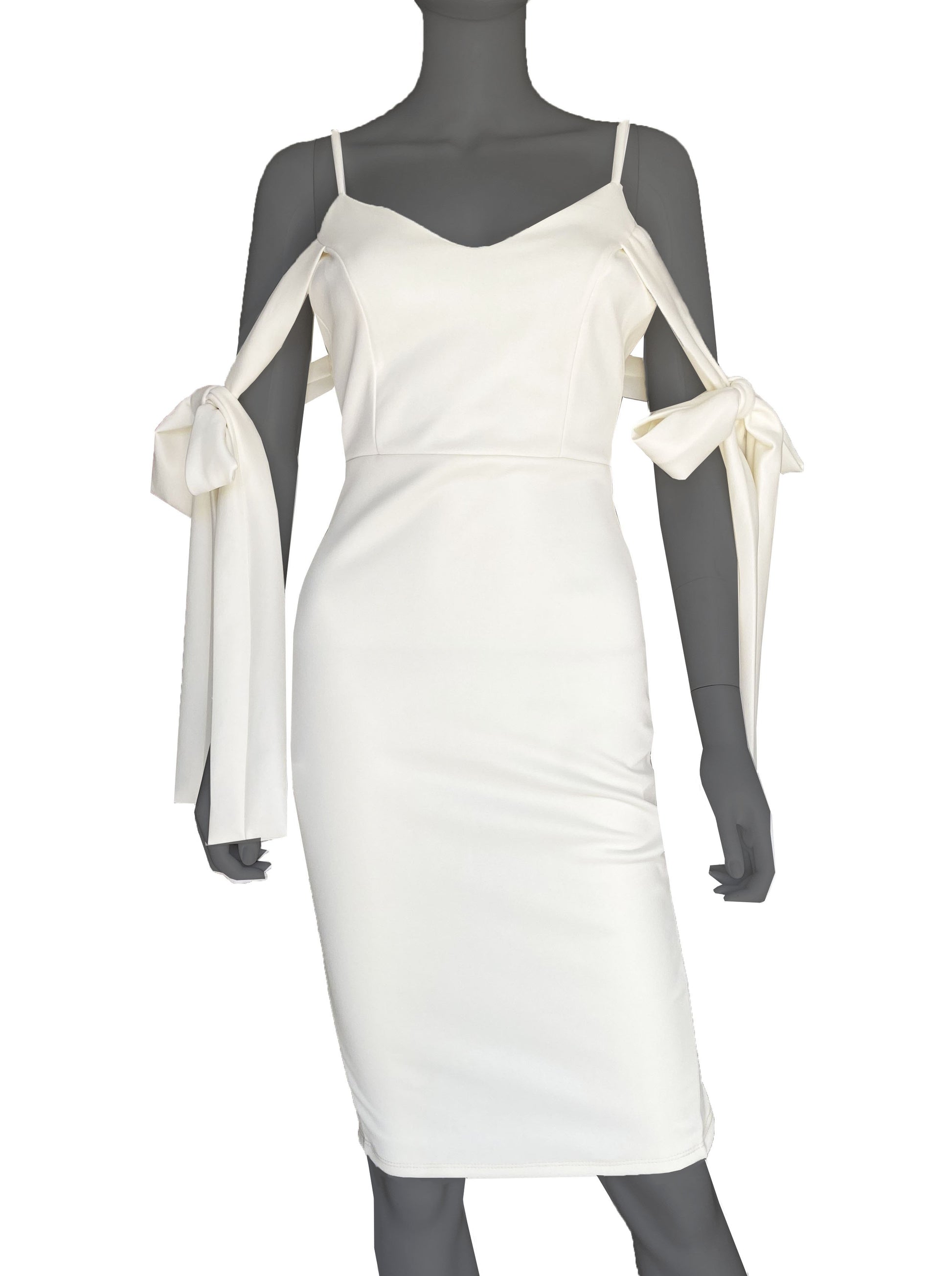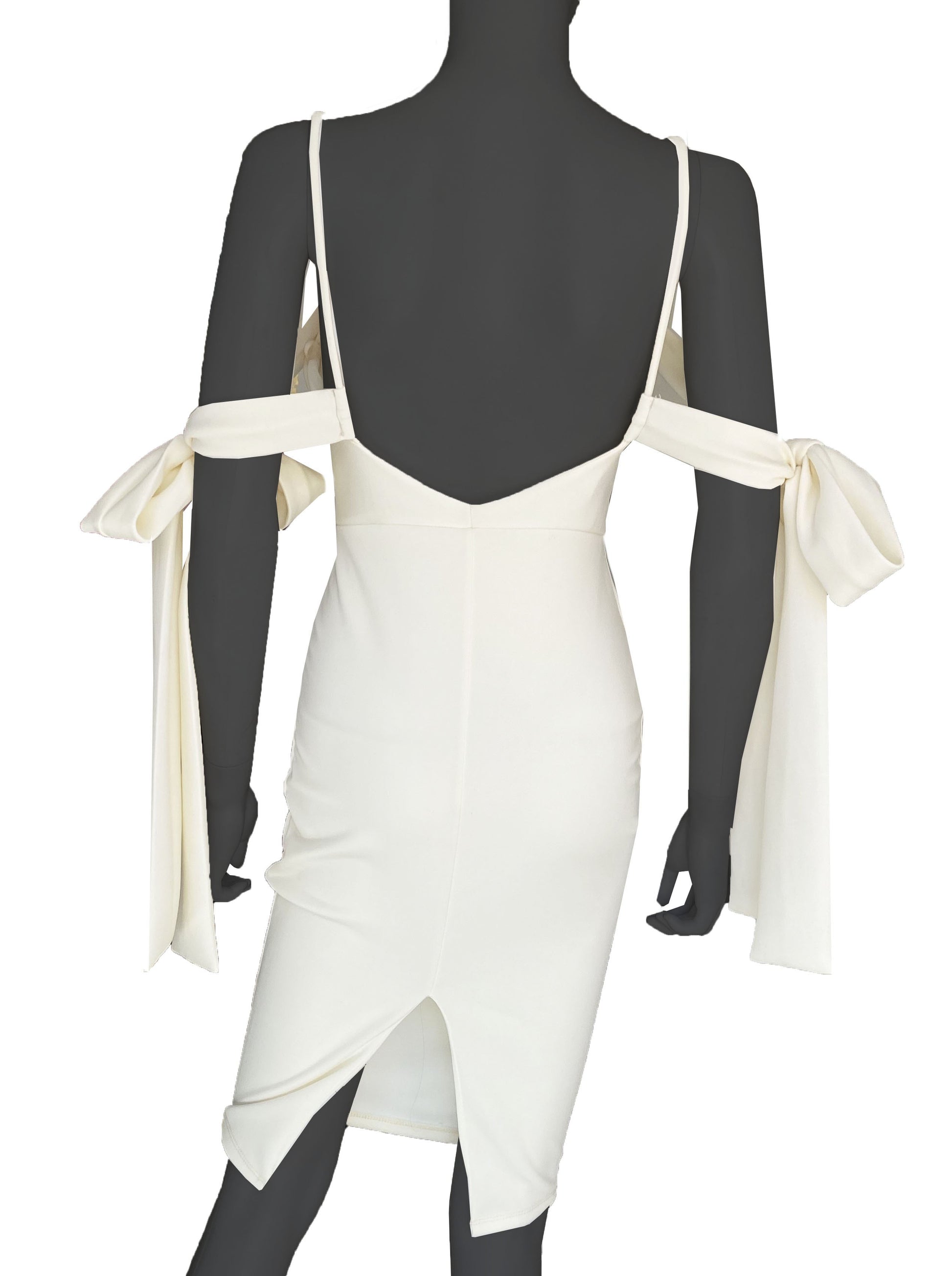 Vestido falda lápiz con espalda descubierta y detalle de amarres en brazos.