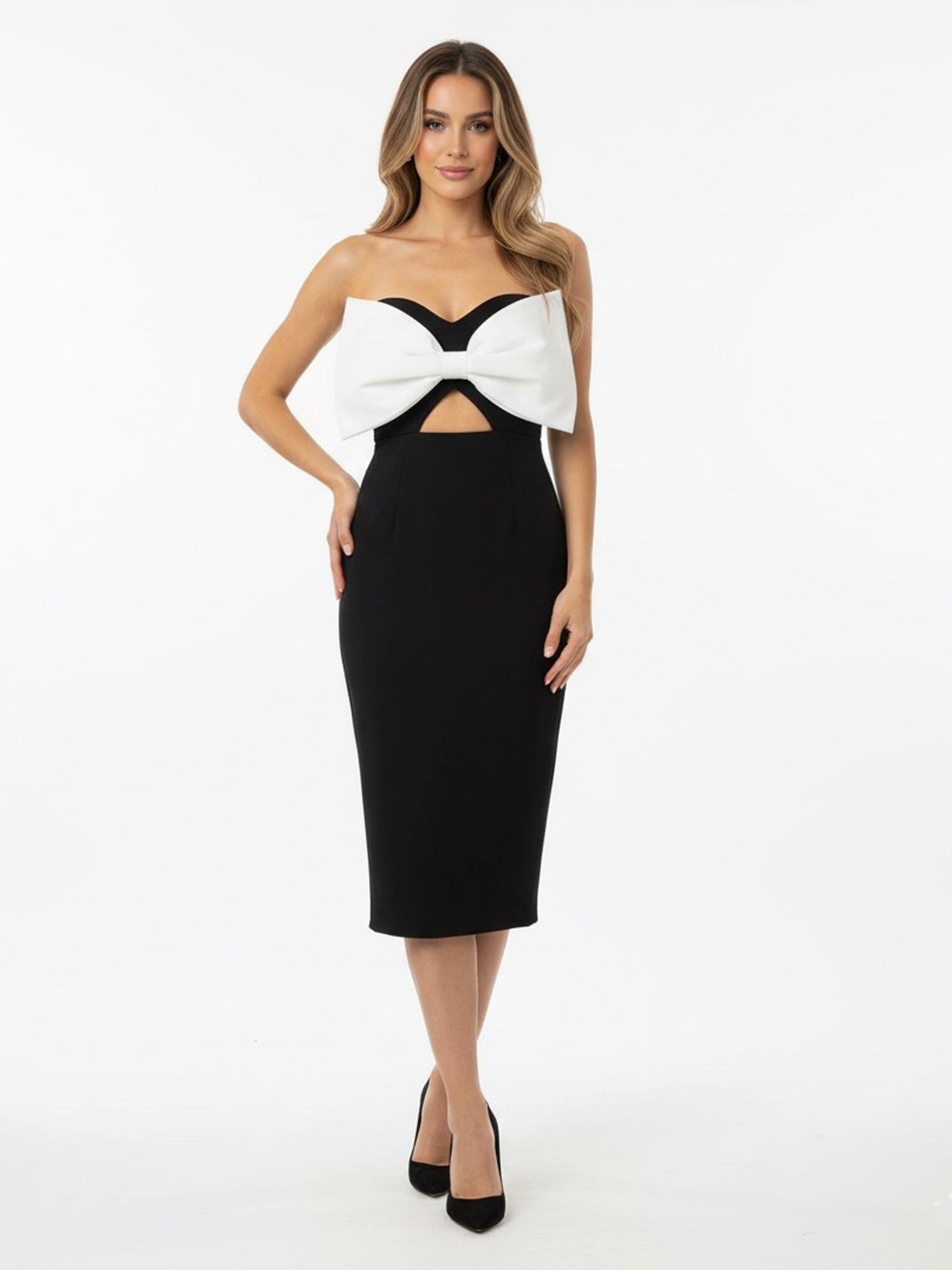 Vestido strapless negro a la rodilla con detalle de moño blanco en pecho.