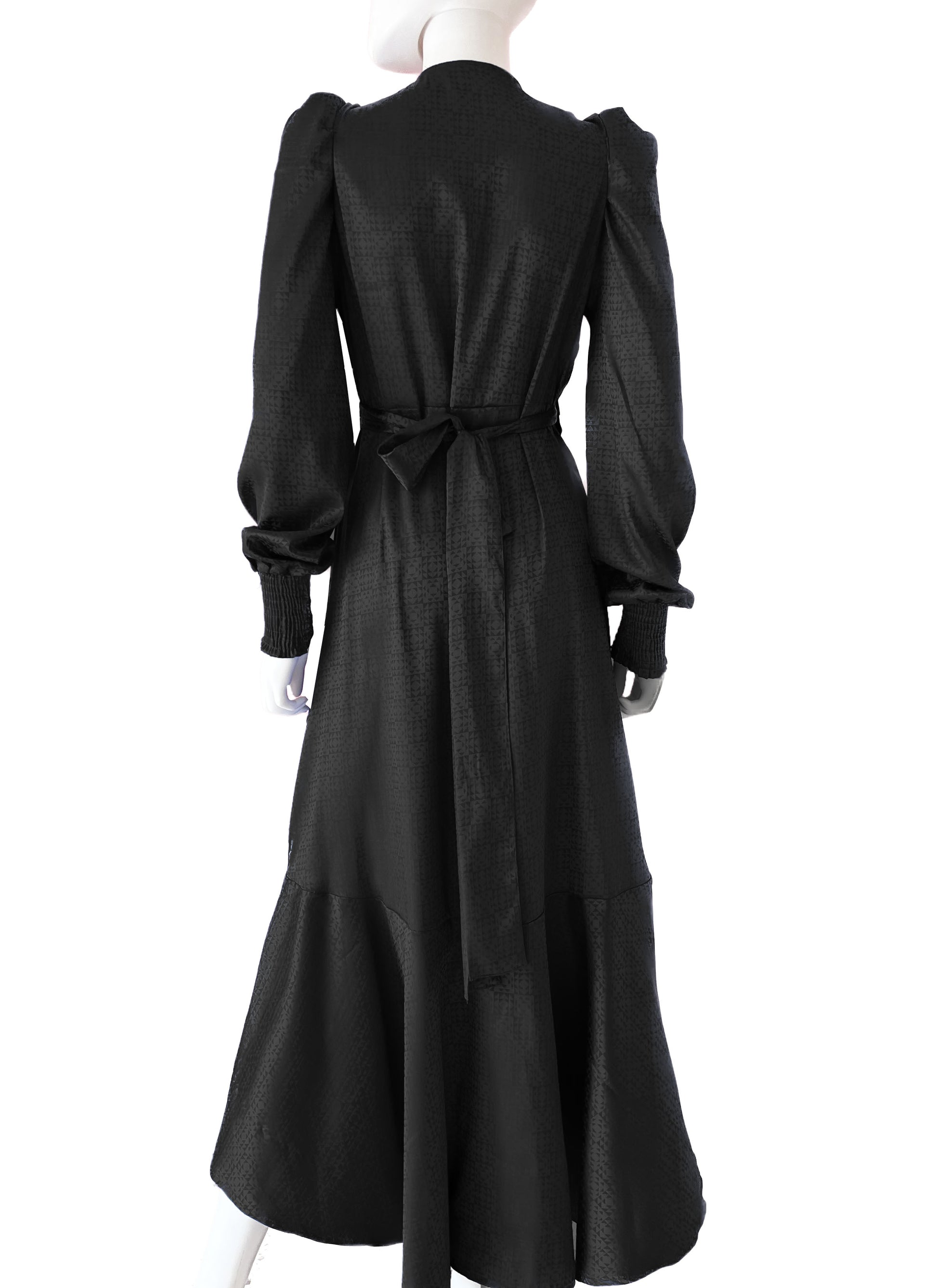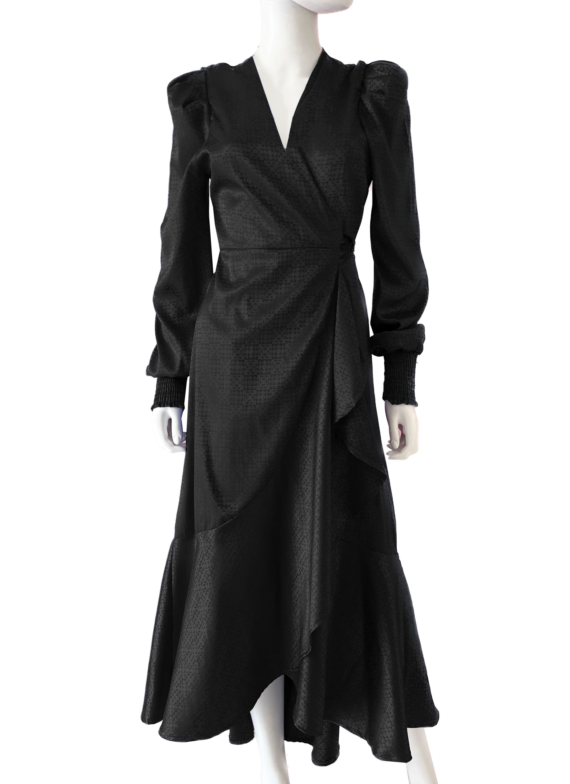 Vestido color negro con detalle de. volantes en falda y mangas largas .