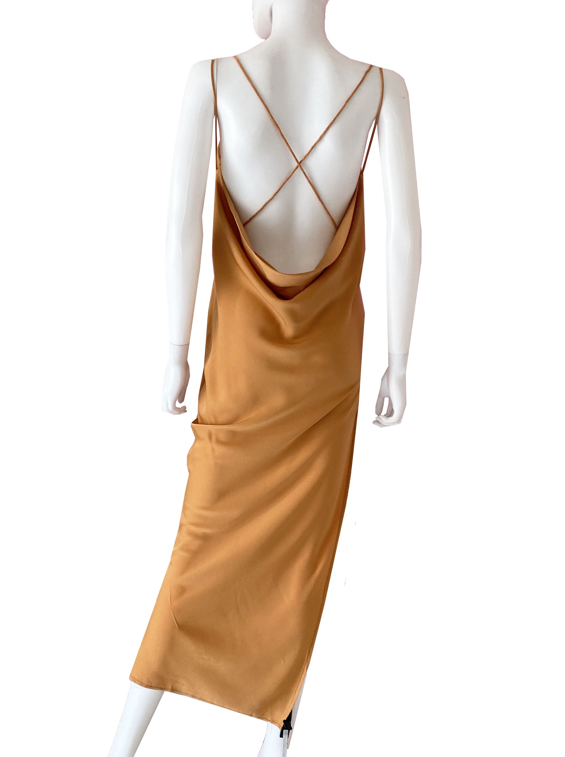 Vestido color chedrón con detalle de tirantes cruzados en espalda.