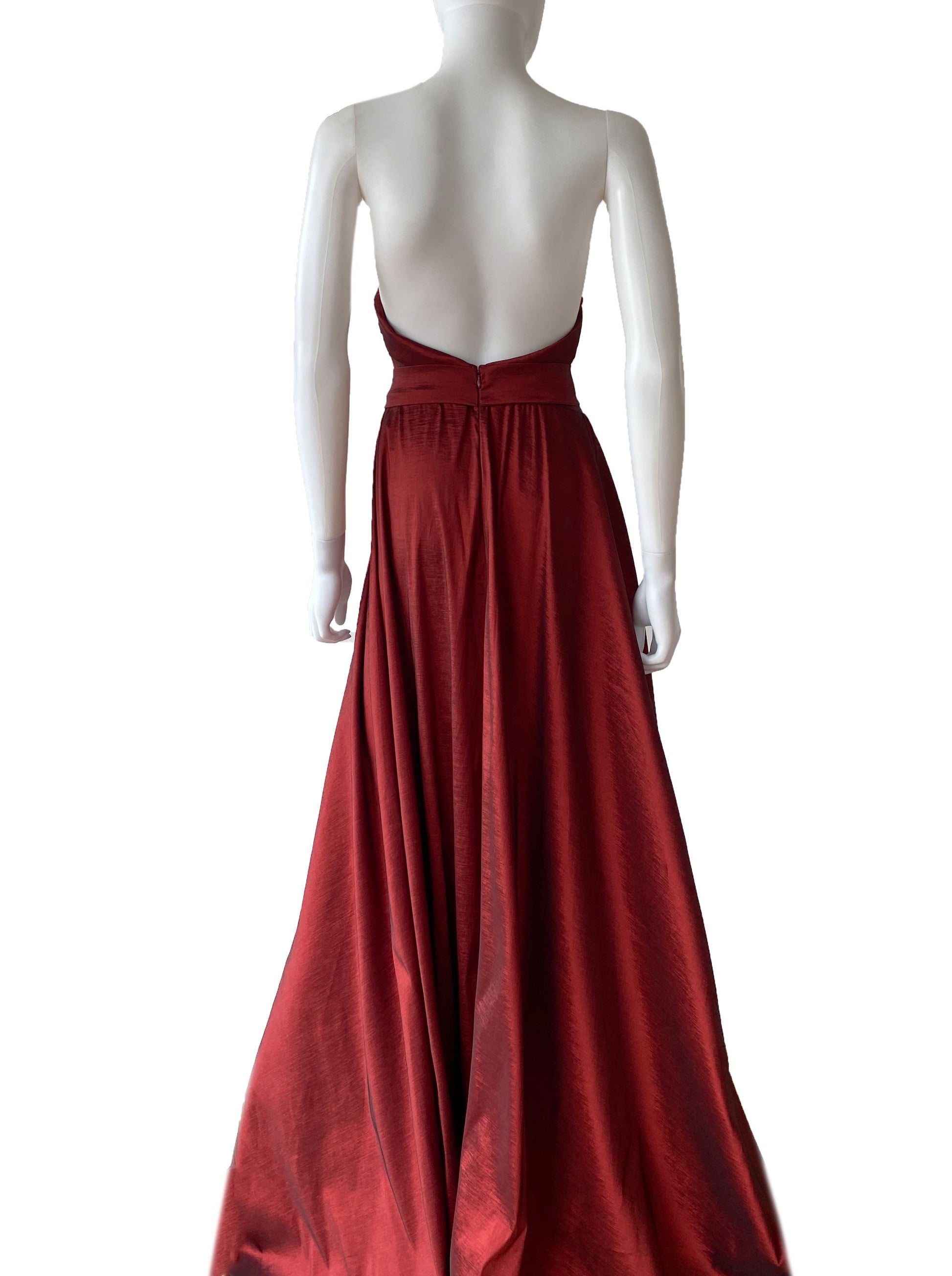 Vestido color tinto strapless con detalle de cintillo en cintura , espalda descubierta y apertura en pierna.