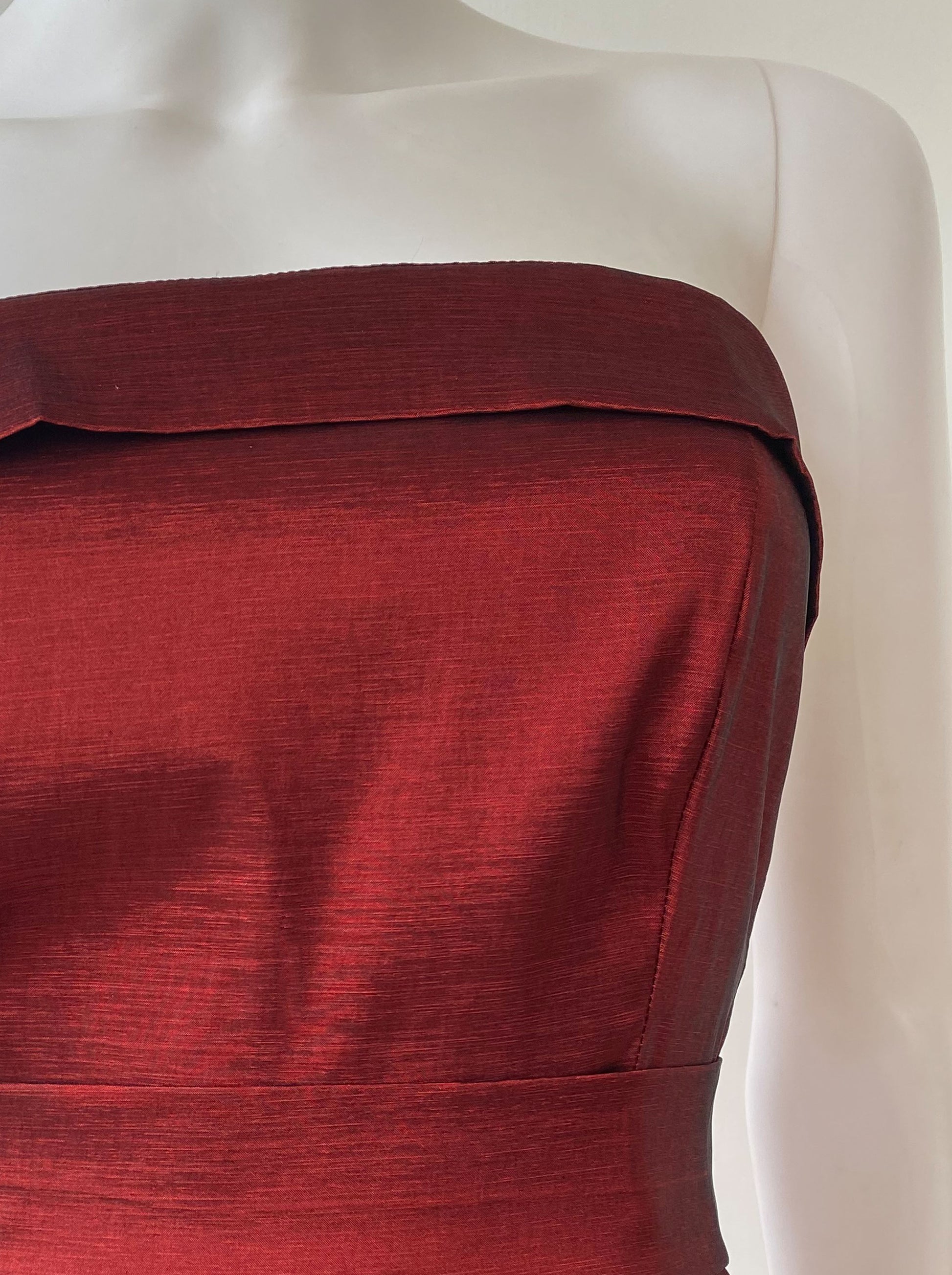 Vestido strapless cintillo tinto.