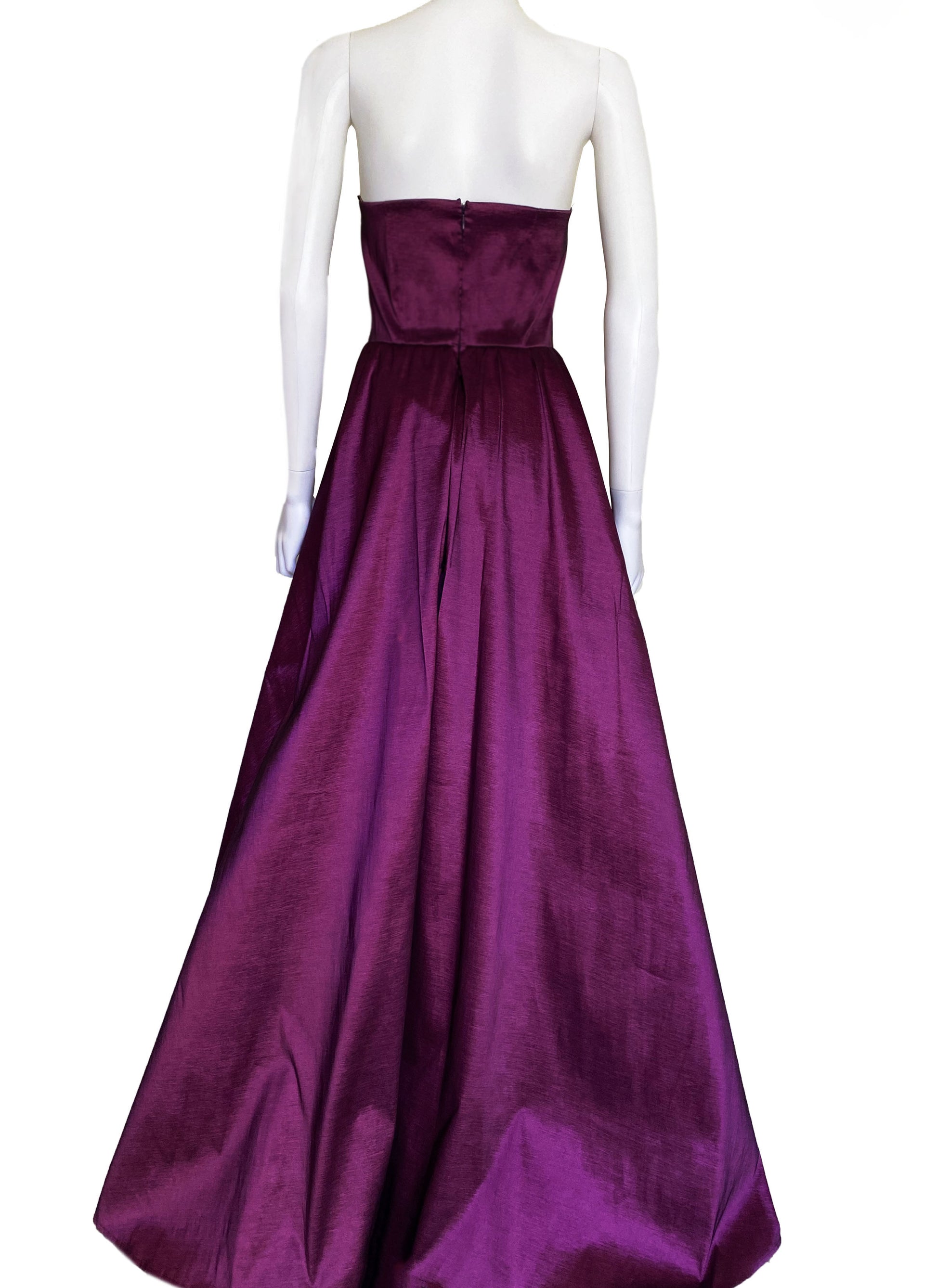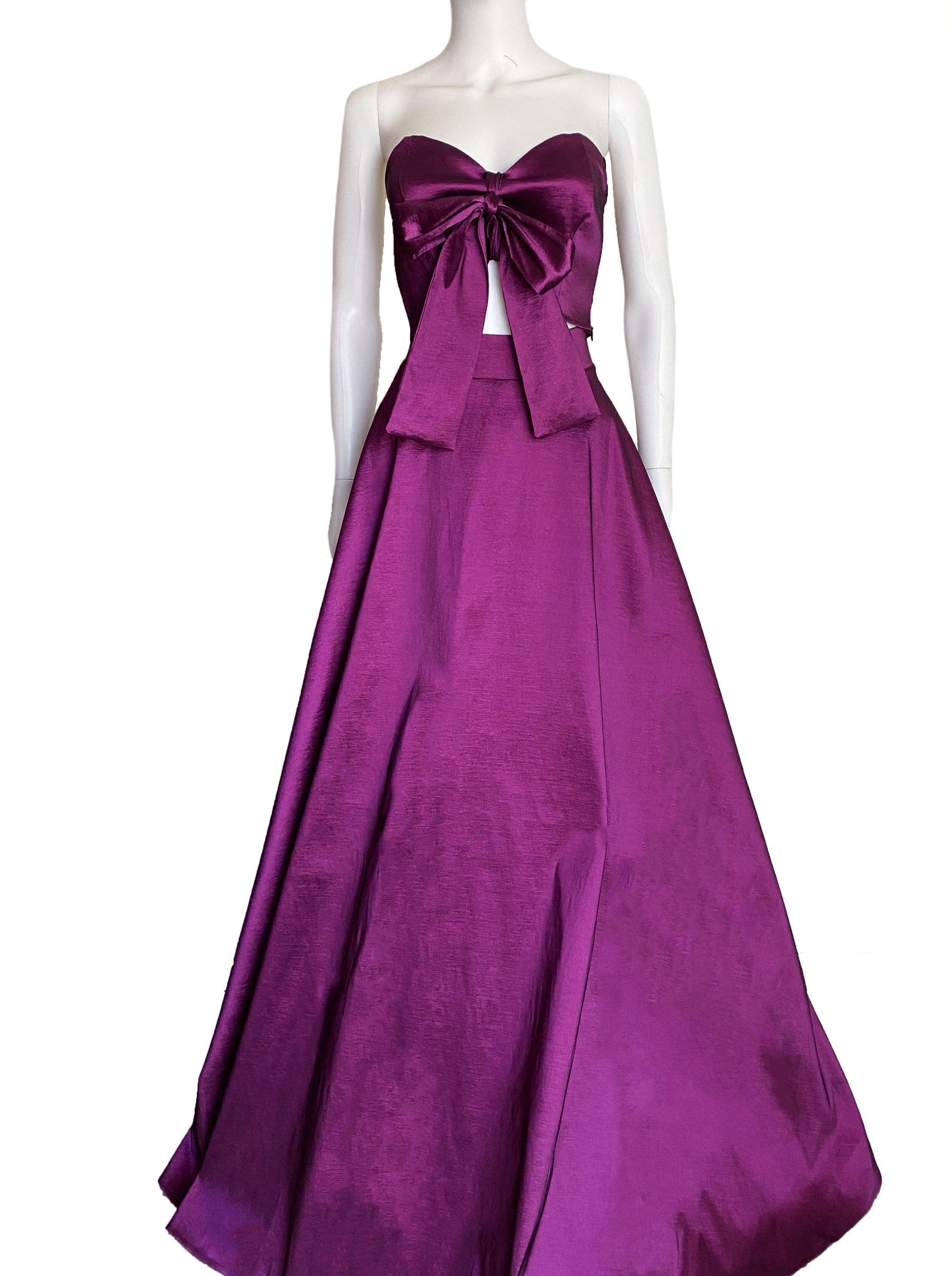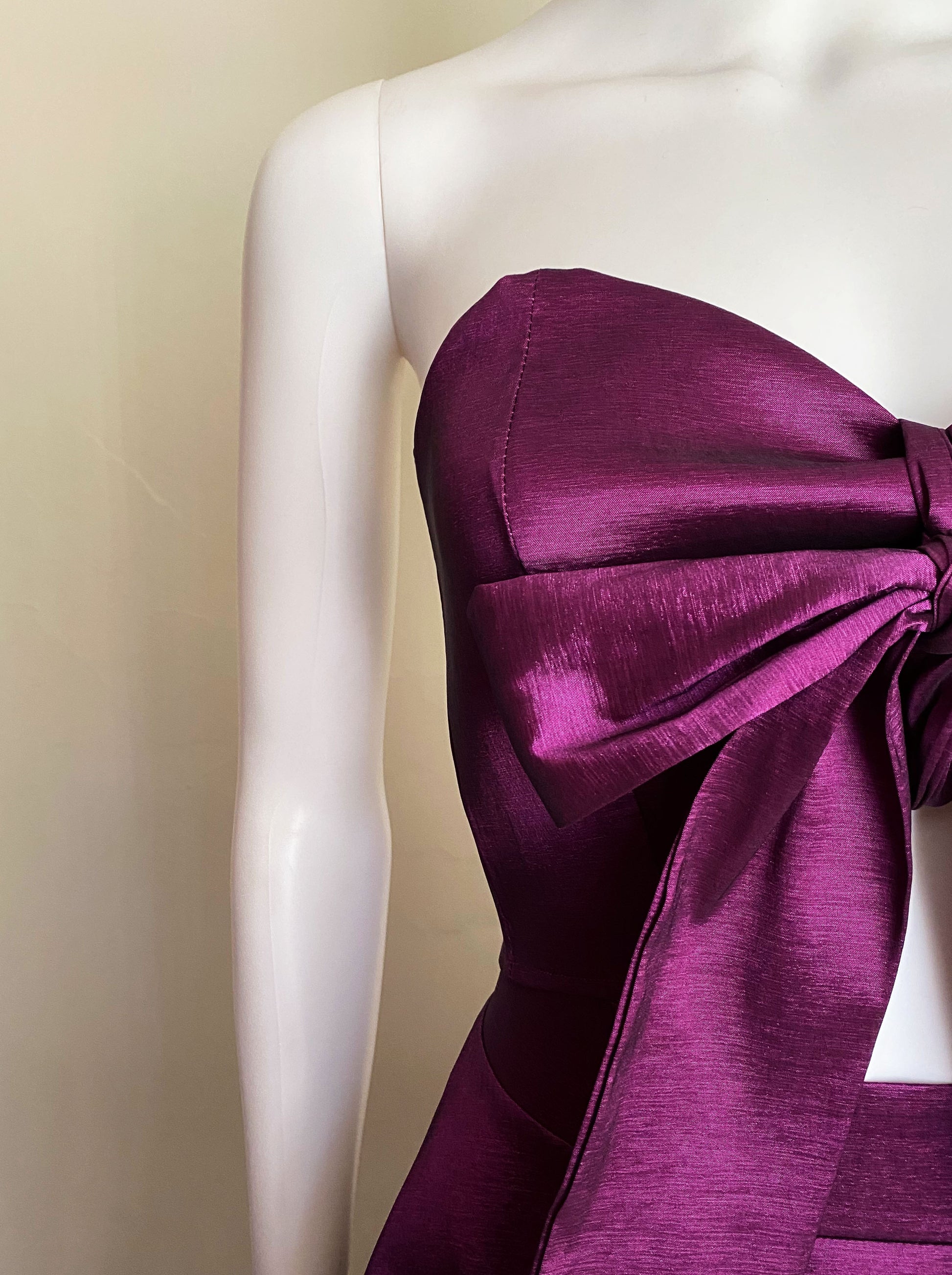 Vestido color morado, con detalle de moño en el pecho , el moño se hace por separado trae un cintillo y este se amarra y da el efecto del moño , el vestido viene en dos piezas pero da efecto de solamente una pieza.