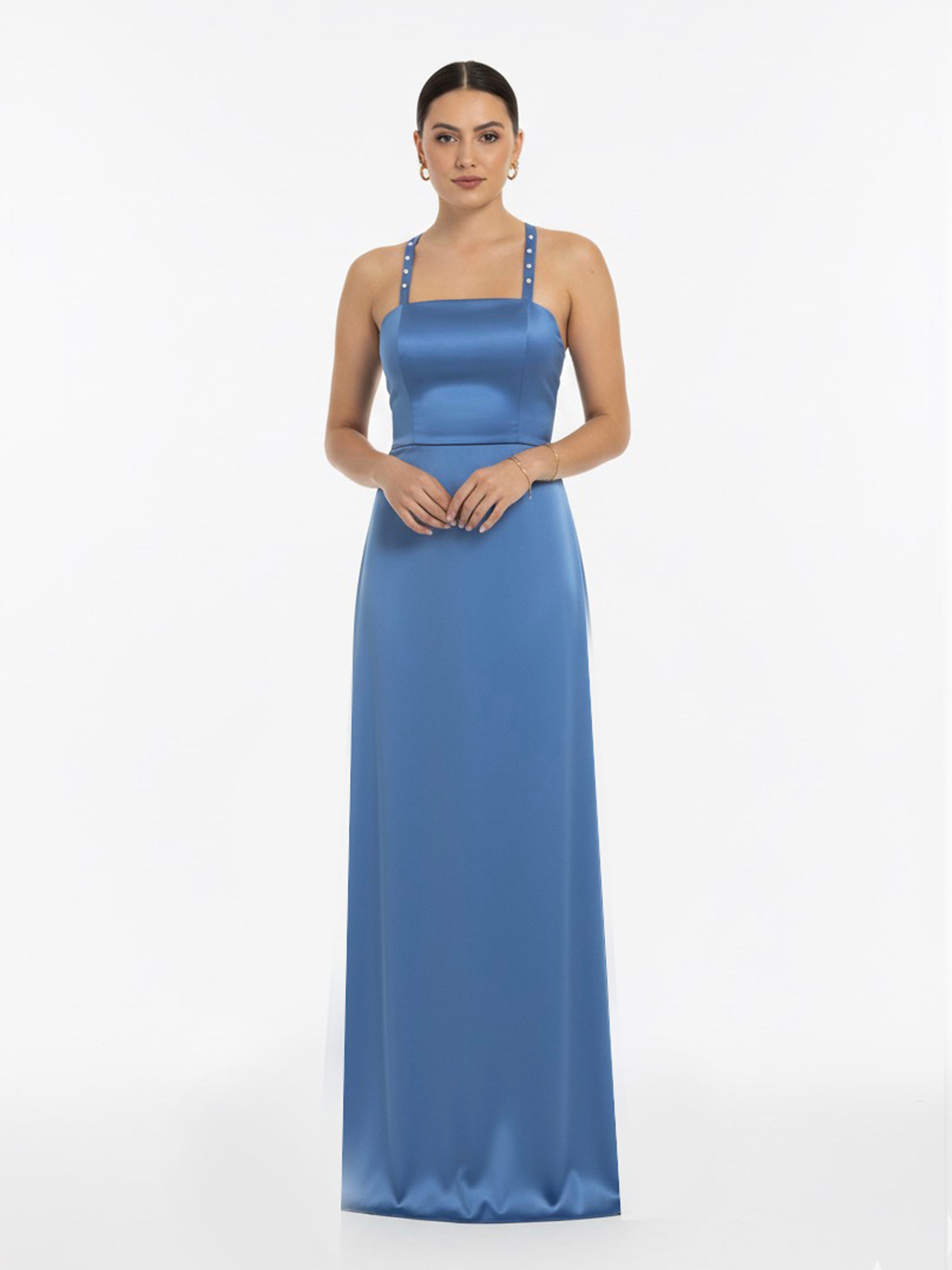 Vestido con detalle de perlas en tirantes y espalda con cruzado.