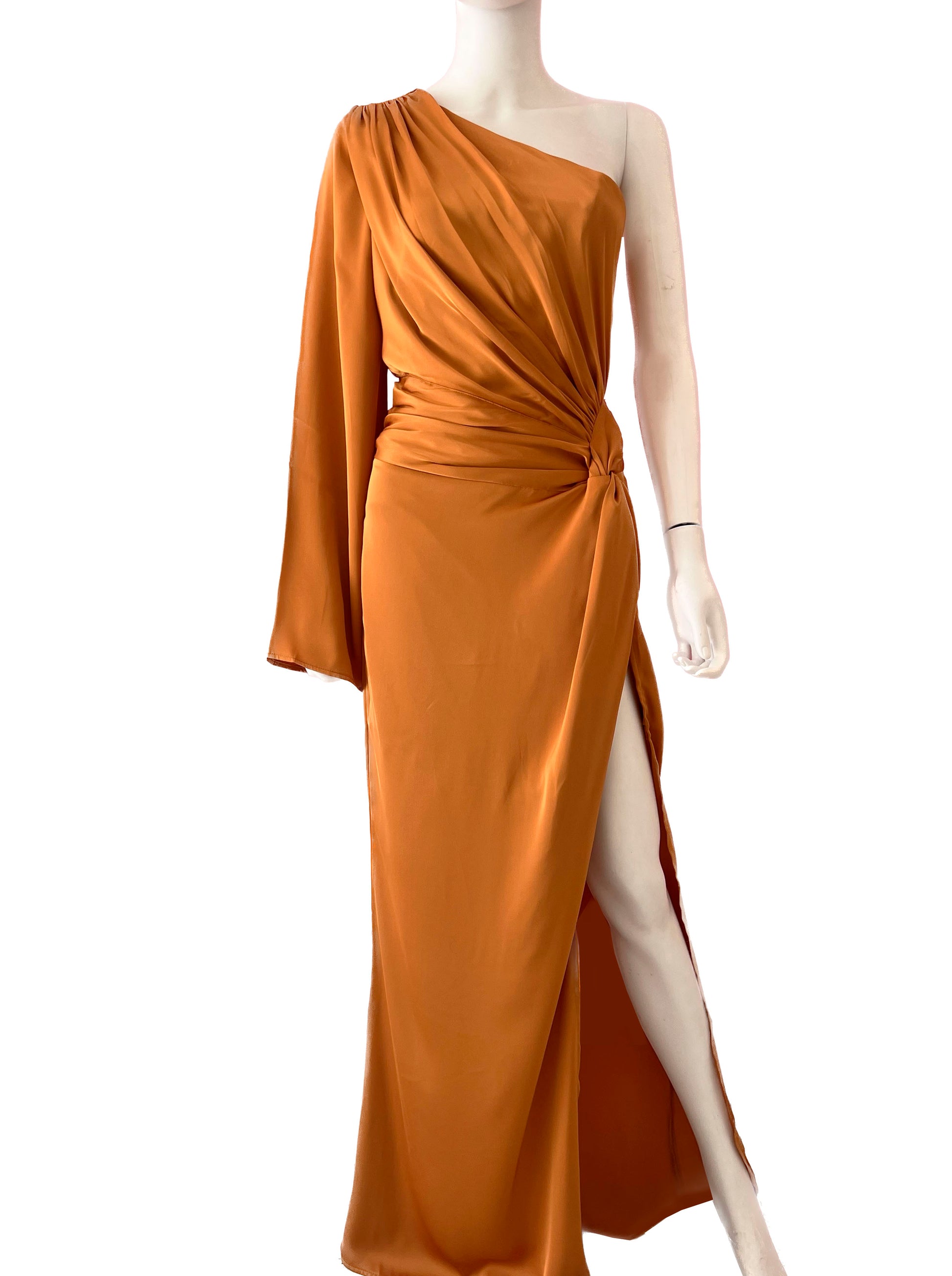 Vestido con una manga larga y drapeado en cintura