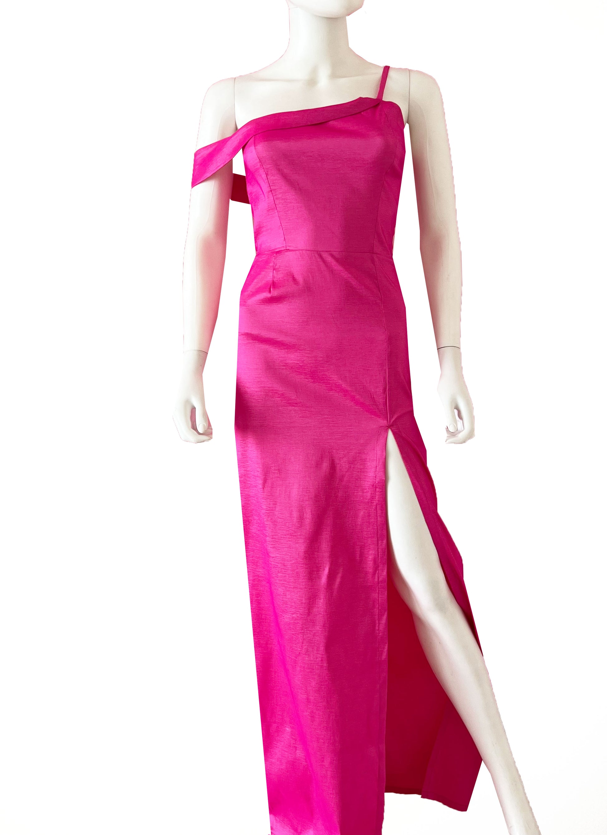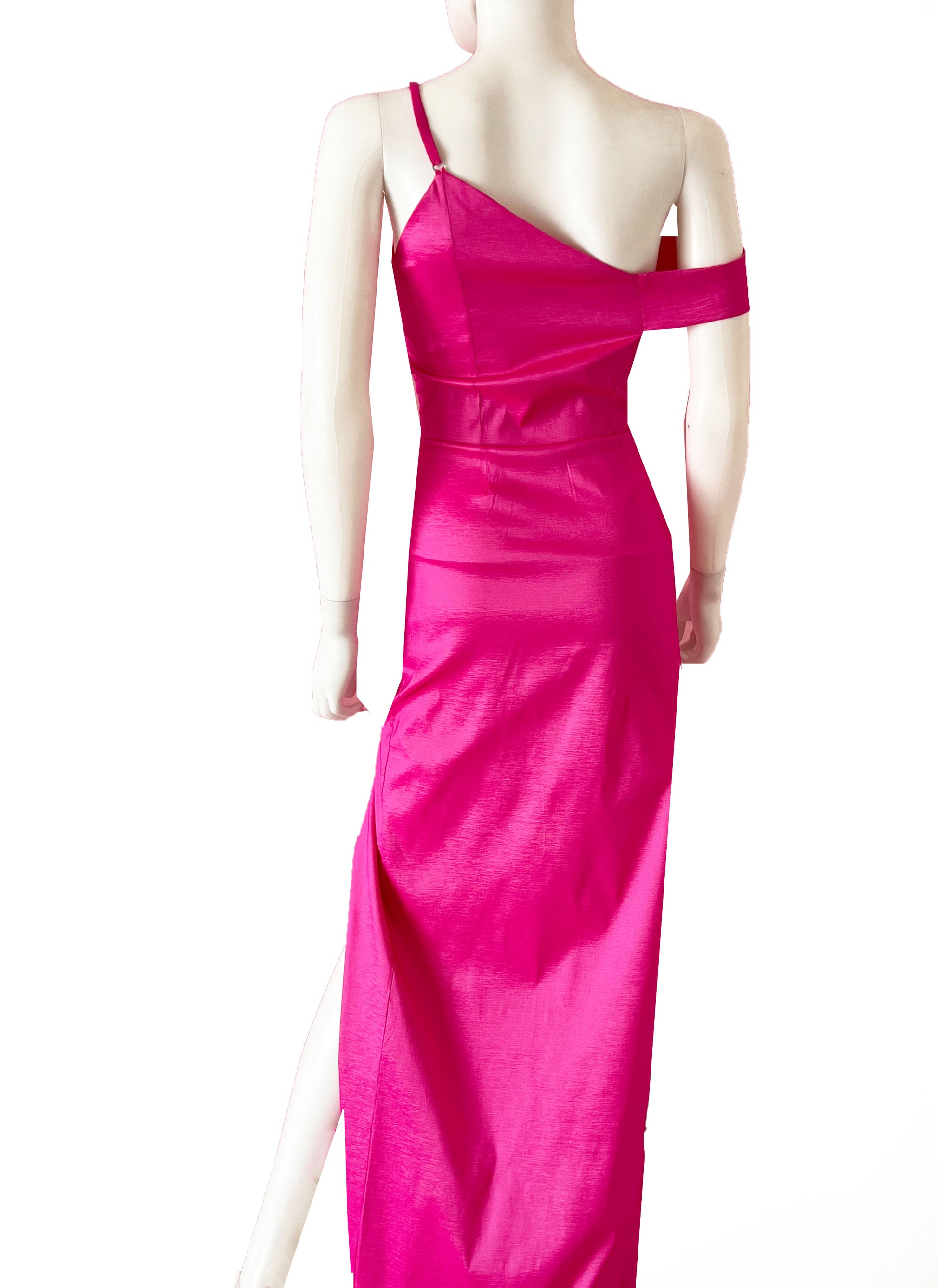 Vestido con doble tirante , uno en hombro y otro en brazo , corte recto y abierta en pierna en color tinto.
