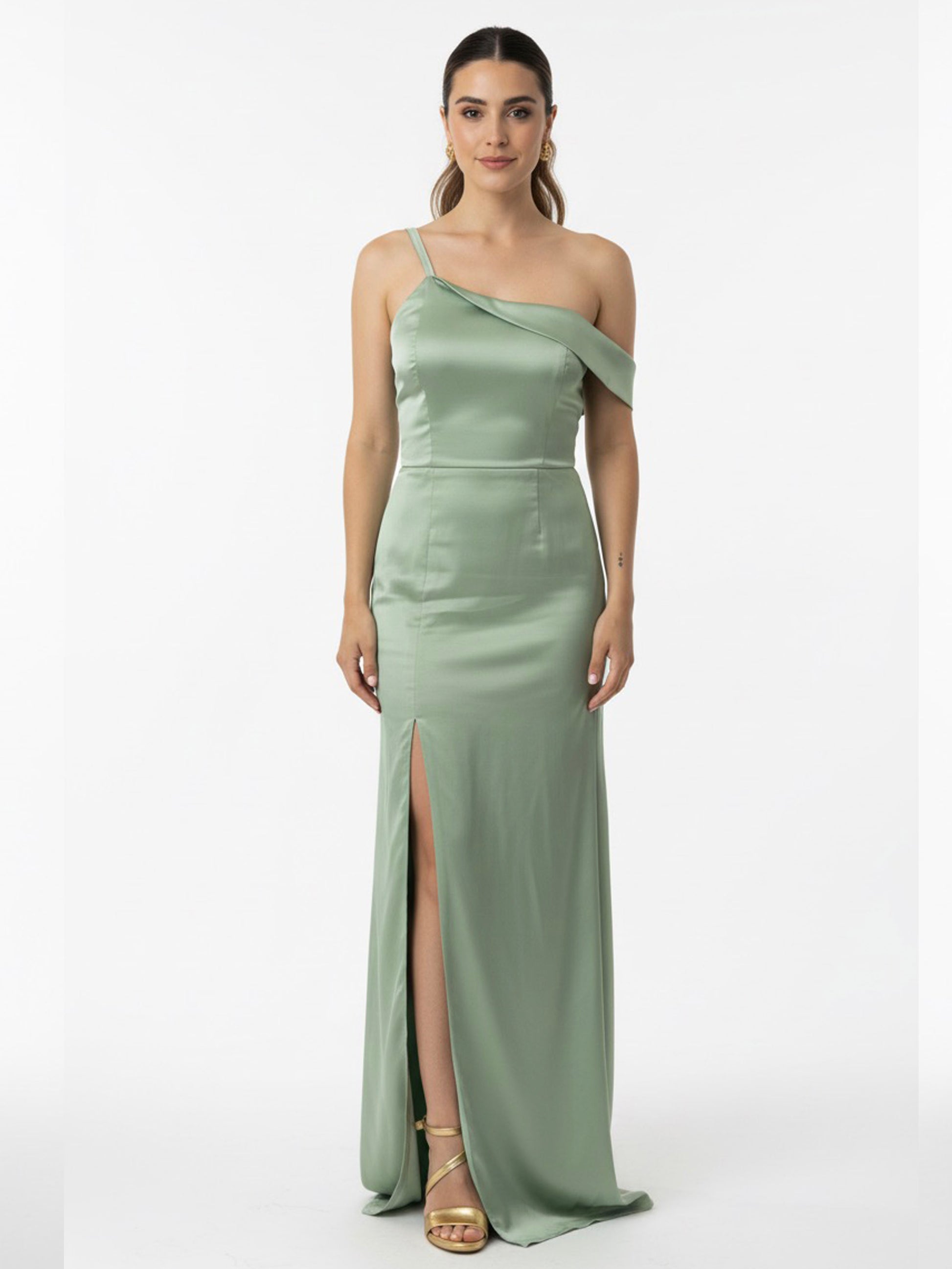 Vestido con doble tirante , uno en hombro y otro en brazo , corte recto y abierta en pierna.