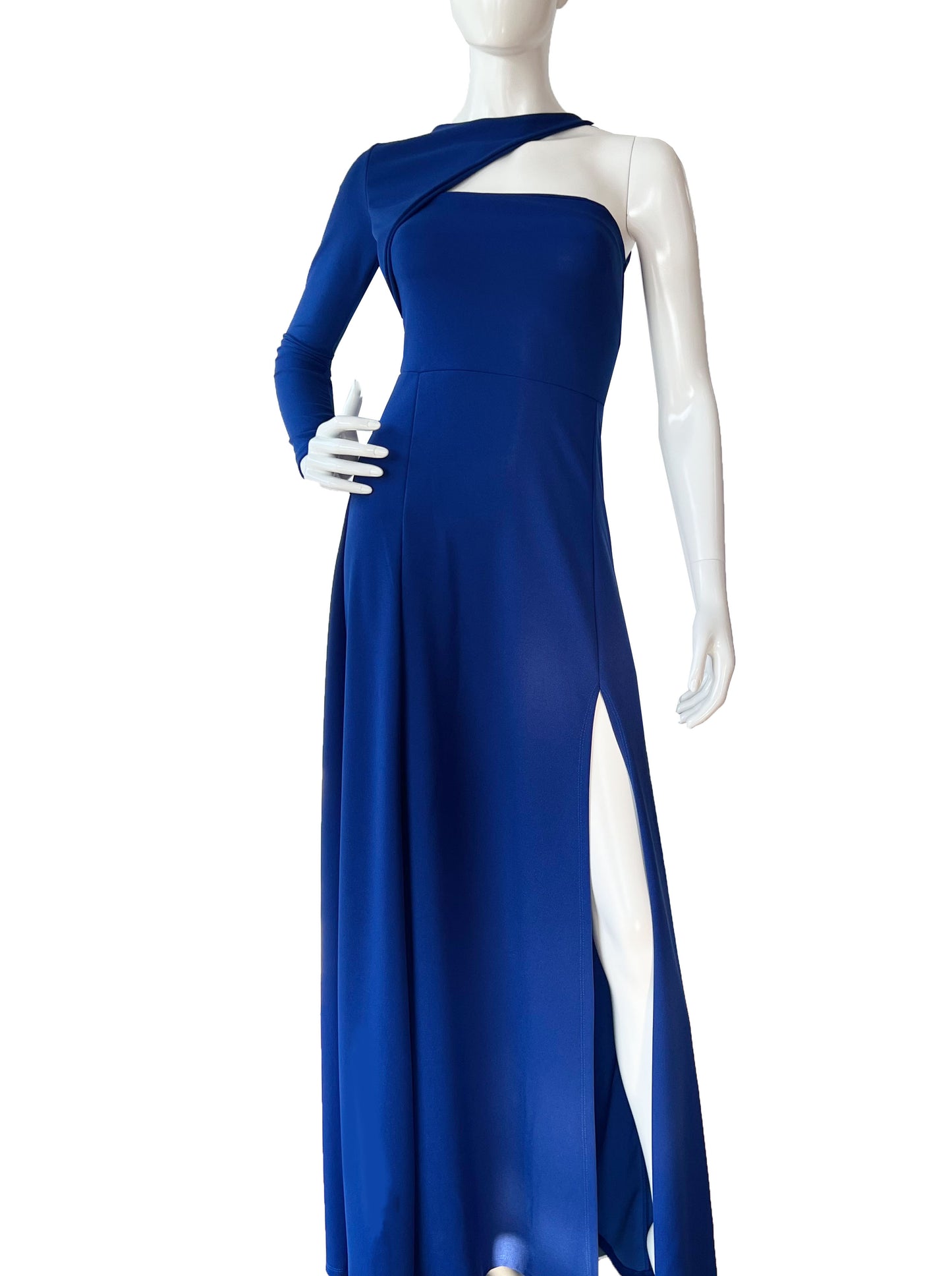 Vestido color azul rey con una manga larga y apertura en pierna.