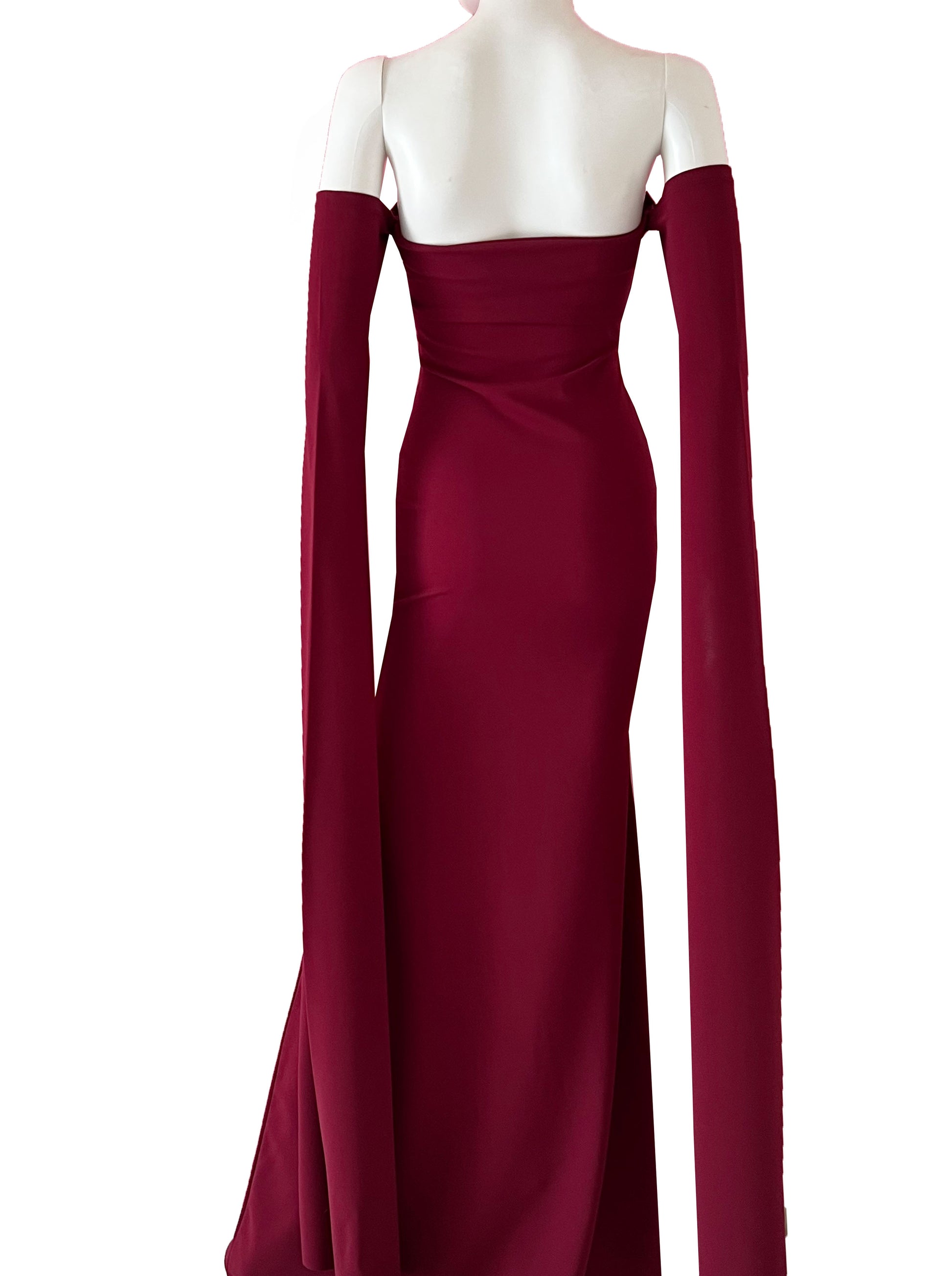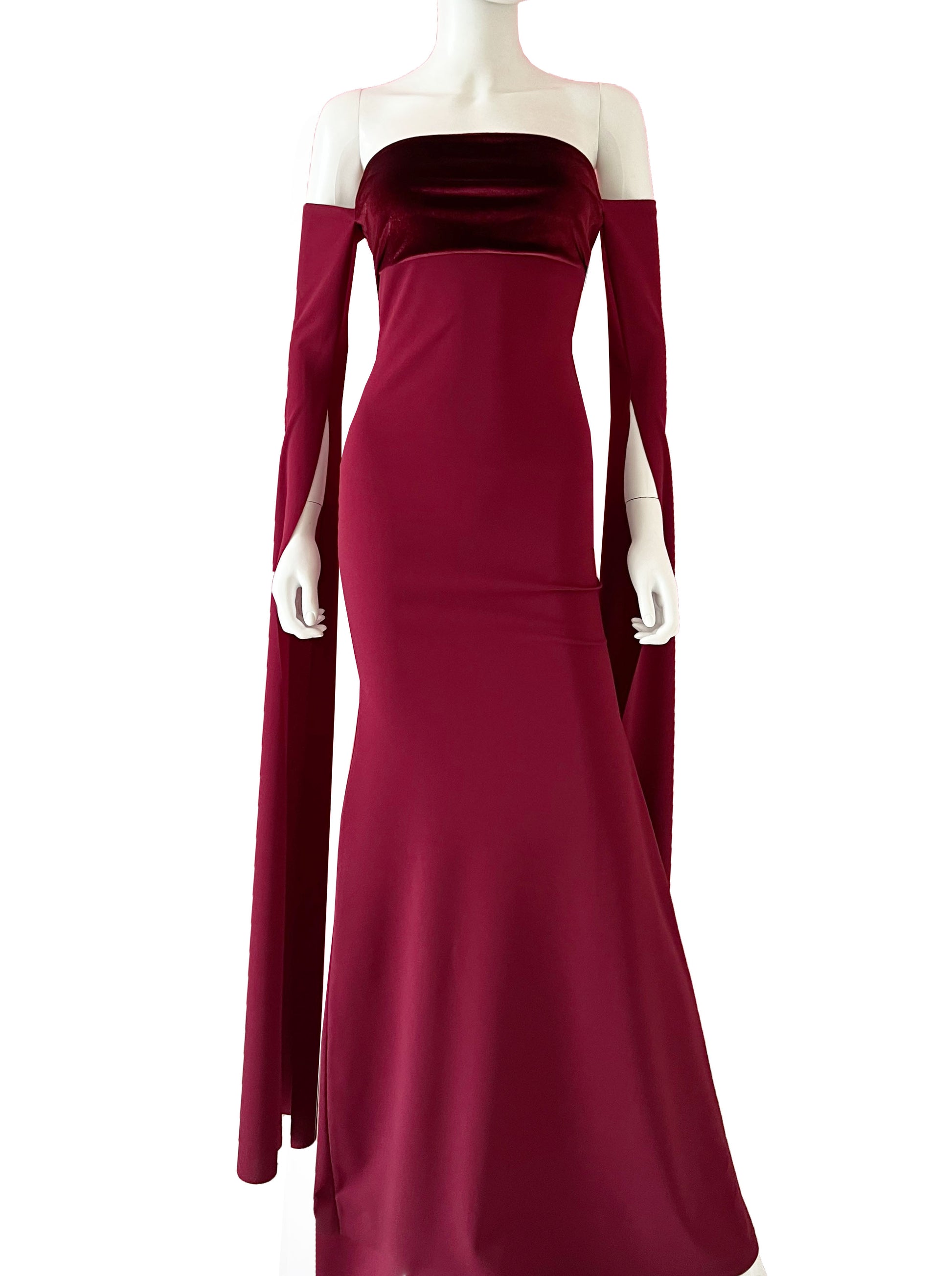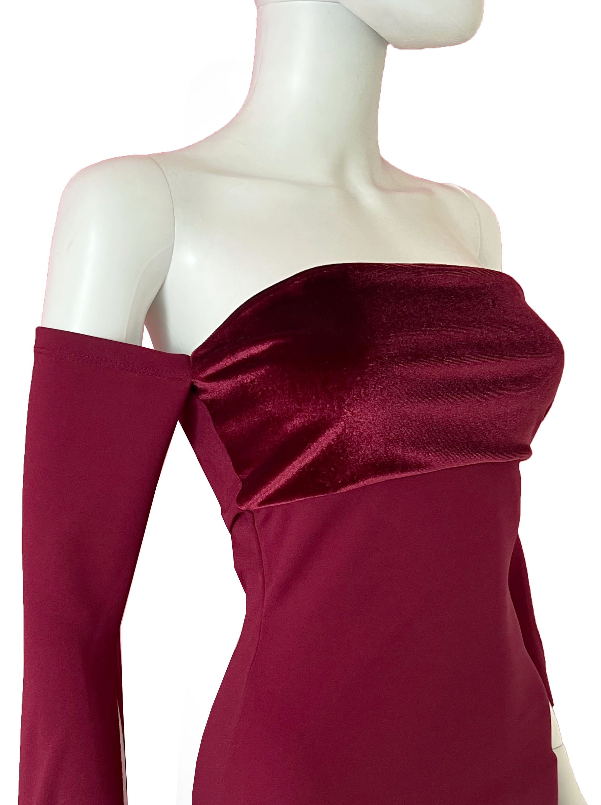 Vestido tinto con mangas colgantes strapless con detalle de velvet.